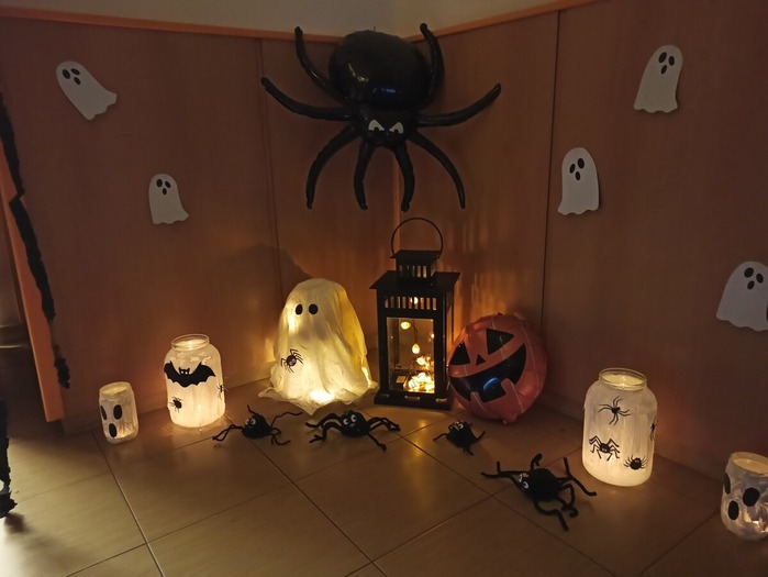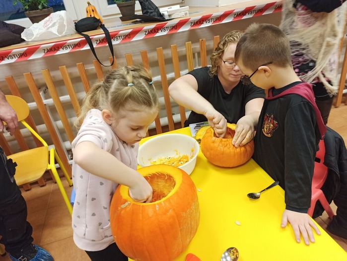 Podzim rozvinul svůj plášť hýřící barvami. Obdivujeme barevné listí a užíváme si posledních teplých slunečních paprsků. Příroda se chystá k zimnímu spánku. Děti z ,,mateřinky“ sledují změny kolem sebe a využívají přírodniny k tvořivému hraní. V pátek 30.10. se celá naše školka a škola proměnily ve ,,Strašidelné“. Všichni se sešli ve strašidelných kostýmech a maskách. Nejstarší školáci si připravili pro nejmenší ,,prcky“ soutěživý program v tělocvičně. A sladká odměna nechyběla! Nejvíce se však děti těšily na podvečerní ,,Dýňování s rodiči“. Venku se šeřilo a školka se proměnila v ,,Doupě pavouků, duchů a jiných příšer“. Atmosféra byla tajemná… Děti se však nebály, protože měly vedle se milující maminku nebo tátu. Všichni se pustili do netradiční práce. Dlabali a vyřezávali dýně pro radost. Muzika hrála a strašidla rejdila…A kdo měl velkou odvahu, prošel si strašidelnou předzahrádkou MŠ. Na cestu domů svítila světélka v dýňových lucernách. Všichni se těšíme, čím nás ještě podzim příjemně překvapí.