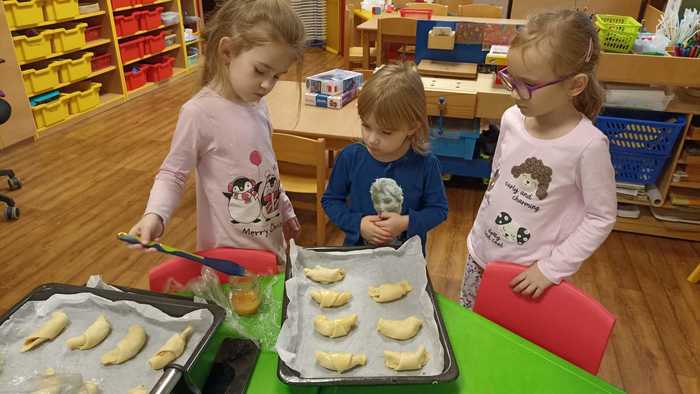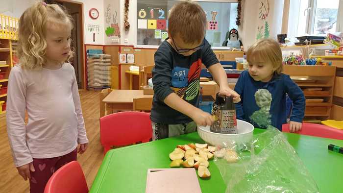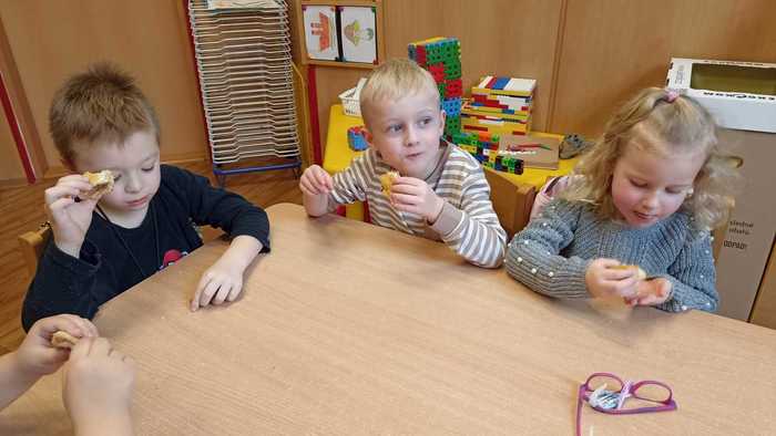 Nejkrásnější svátky v roce se blíží, a tak se s dětmi v mateřské škole snažíme různými aktivitami vytvářet předvánoční atmosféru. K prvním vánočním poslíčkům patří svátek svatého Martina a s ním i často kladená otázka. Přijede letos Martin na bílém koni? Aby nám to těšení rychleji utíkalo, pustili jsme se do pečení svatomartinských rohlíčků. Děti strouhaly jablíčka, válely těsto a jeho plněním a balením vznikaly nádherné rohlíčky. Pečení je velmi bavilo a největší odměnou byla ochutnávka upečené sladké dobroty.