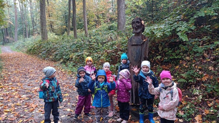 Dne 17.10.2025 se děti ze třídy „Ježečků“ z MŠ Hanušovice vydaly na výlet do Čarovného lesa. Čarovný les se nachází v Šumperku kousek nad „Sanatorkou“. Cestu autobusem děti hravě zvládly, a tak jsme se vydali vzhůru za dobrodružstvím. Neodradil nás ani slabý déšť. Při vstupu do lesa děti pozorovaly barevnost stromů, padající listí a zaujalo je také nádherné ticho. Cestou rozlišovaly zvuky přírody a nejvíce je zaujaly hlasy divokých kachen, které nás už na dálku vítaly svým hlasitým gagotáním. Kachny obývají tři malé rybníčky podél cesty, kde se děti také usadily na lavičky a vydatně posvačily, protože cesta lesem mírně stoupala do kopce. Lesní cesta je lemovaná dřevěnými pohádkovými postavami a malými studánkami, které děti vyčistily od spadaného listí. Na konci cesty děti čekalo překvapení v podobě „Pavoučího hřiště“, kde si děti vyzkoušely svou fyzickou zdatnost, odvahu, spolupráci a hlavně hodně radosti. Cesta nazpět proběhla svižným tempem a za halasného vyprávění zážitků z výletu. Na autobusové zastávce si ještě děti zazpívaly píseň „Vyletěl si pyšný drak“, nasedly do autobusu a vrátili jsme se všichni spokojení, i když trošku unavení, domů.