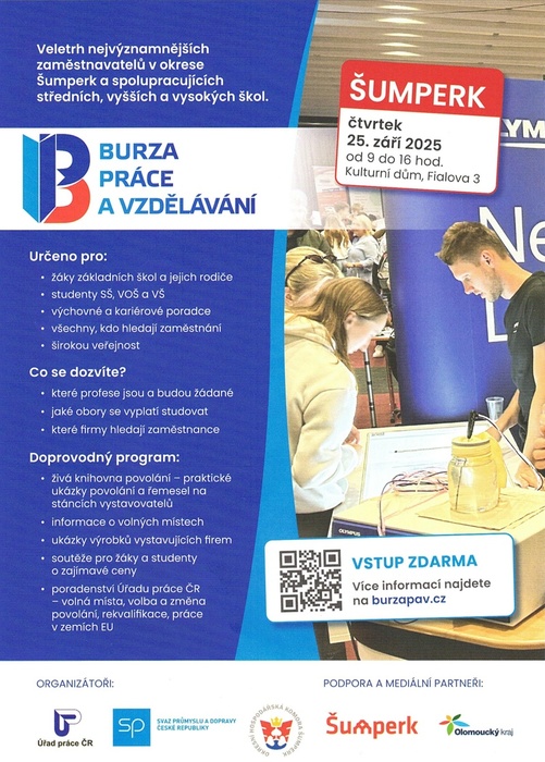 Veletrh nejvýznamnějších zaměstnavatelů v okrese Šumperk a spolupracujících středních, vyšších a vysokých škol.