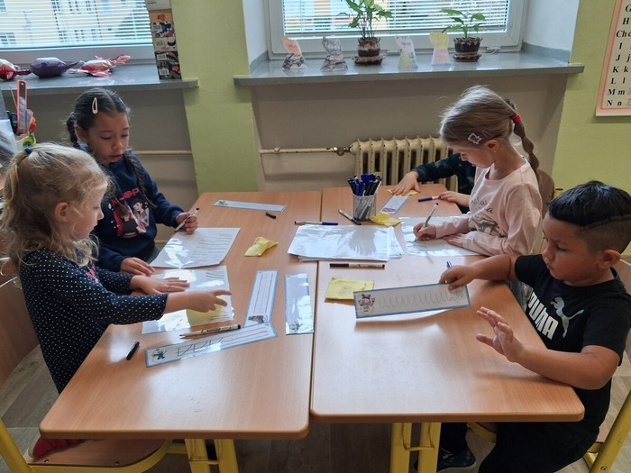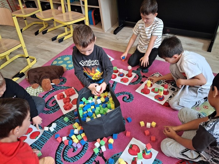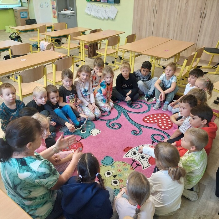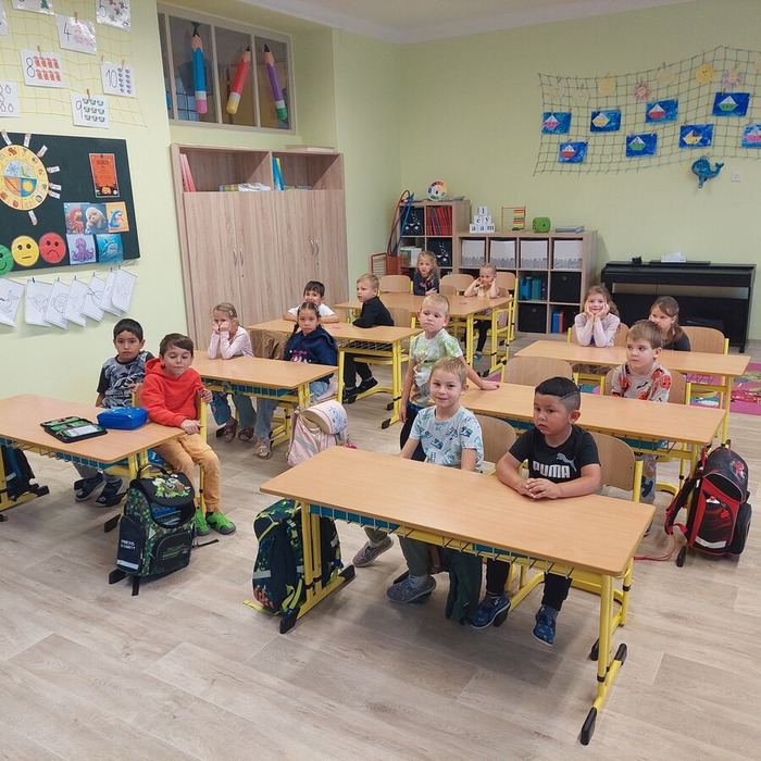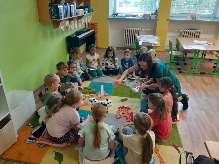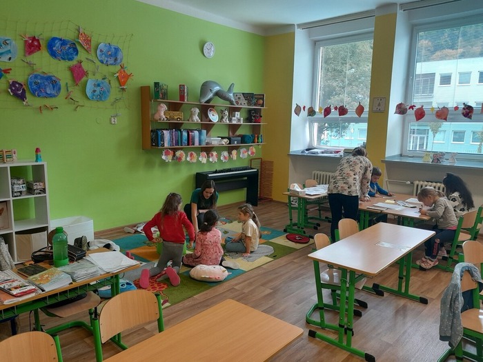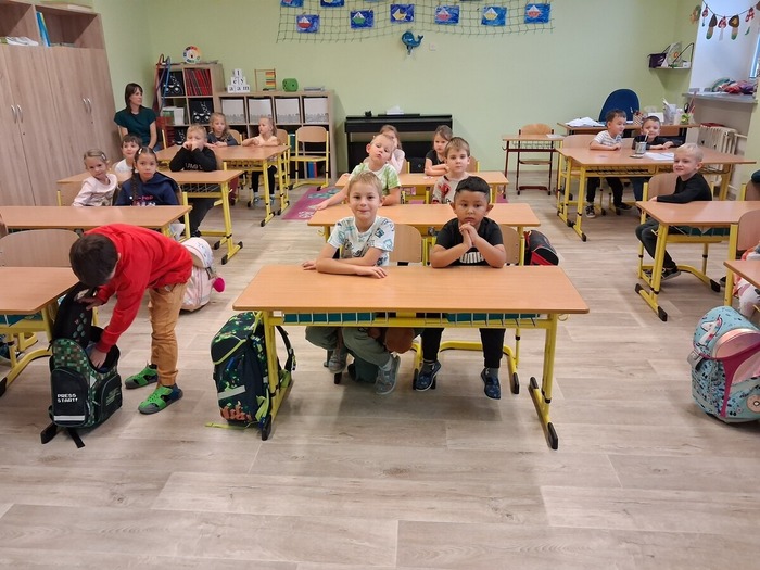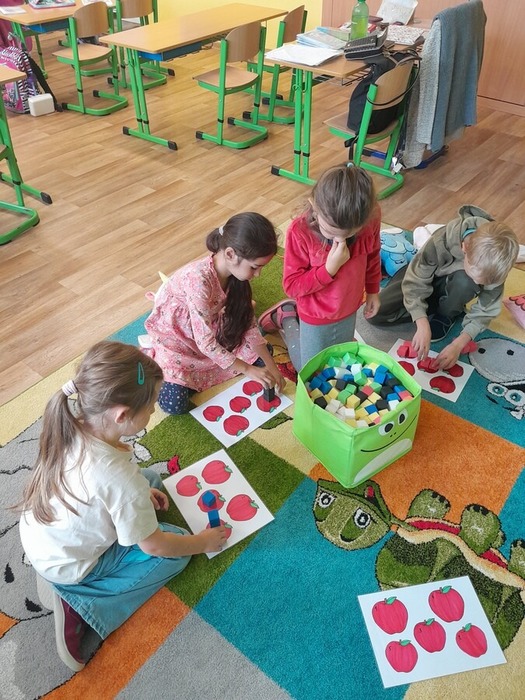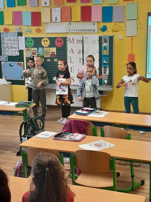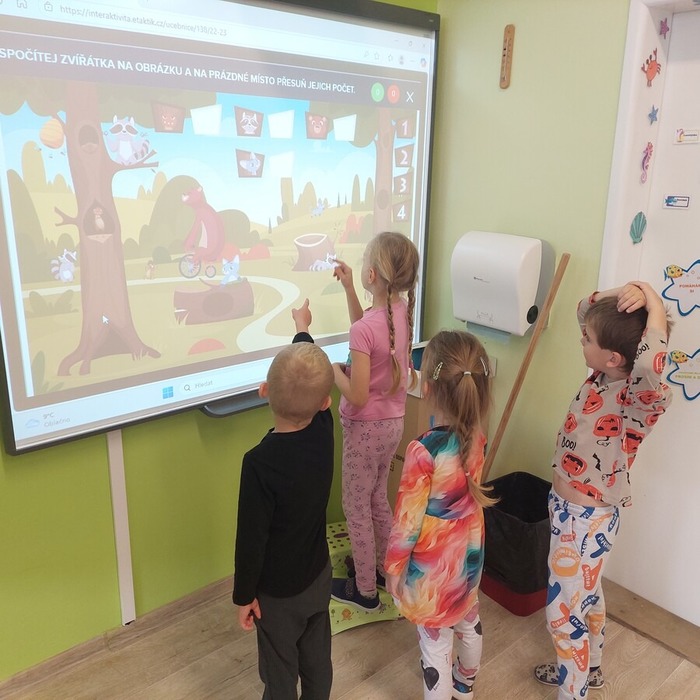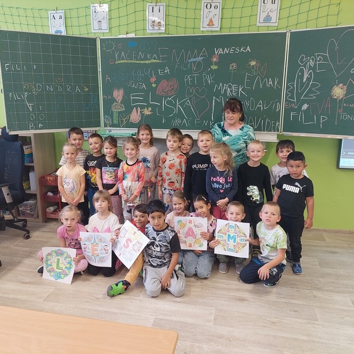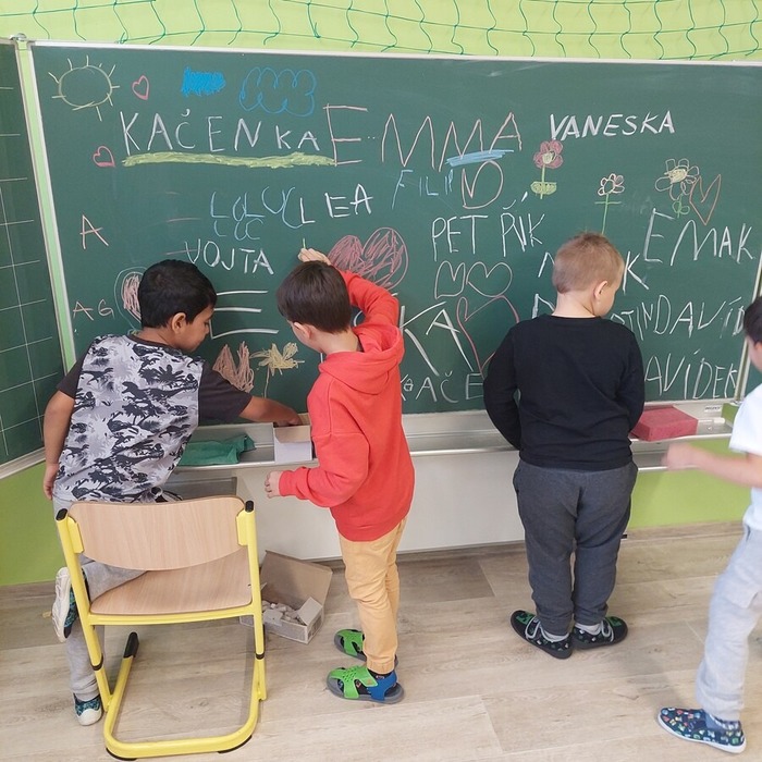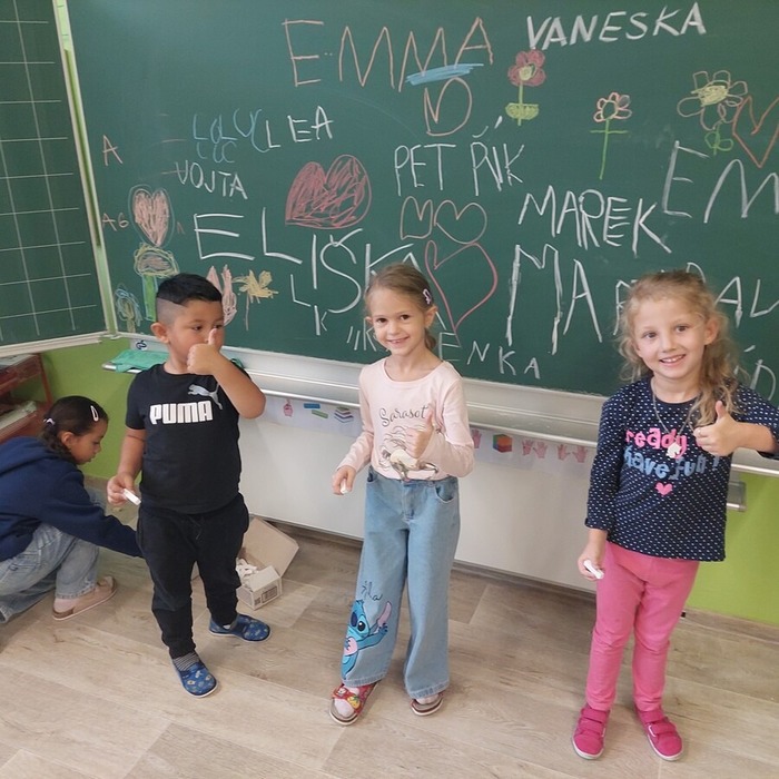 Dne 9. 10. 2025 jsme uvítali v prvních třídách své kamarády ze školky. Přivítali jsme je písničkou a krátkou ukázkou toho, co už umíme. Potom jsme se všichni představili, vytleskávali slabiky, počítali s kostkami a zkoušeli si obtahovat na interaktivní tabuli grafomotorické cviky, na památku se nám všichni podepsali na tabuli, nebo něco hezkého nakreslili.