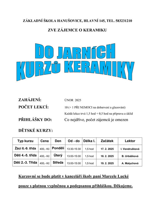 Kurzovné se bude platit v kanceláři školy paní Marcele Lucké pouze s platnou vyplněnou a podepsanou přihláškou. Děkujeme.