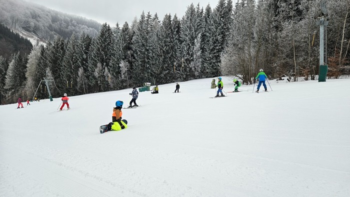 Přednost dostali žáci 7. ročníku, kteří mají lyžařský výcvik v osnovách, a tedy je pro ně povinný. Protože je sedmáků málo, připojila se k nim i skupinka dobrovolných šesťáků. Sněhové podmínky byly vynikající a do čerstvě napadaného prašanu se skvěle padalo. Takže i ti nejvíce bojácní se nakonec naučili na lyžích i snowboardu točit obloučky (k velké radosti nejen jich samotných, ale i k radosti instruktorů).