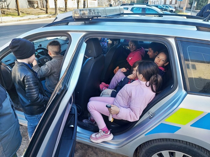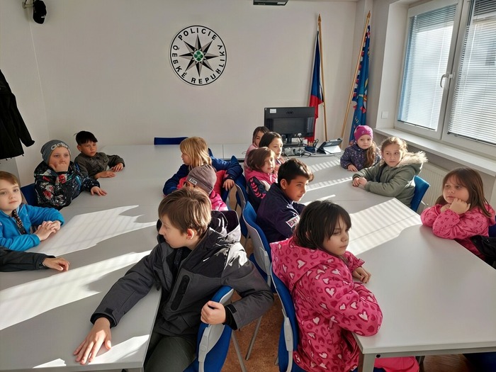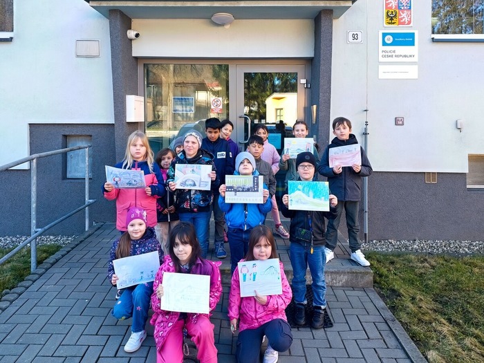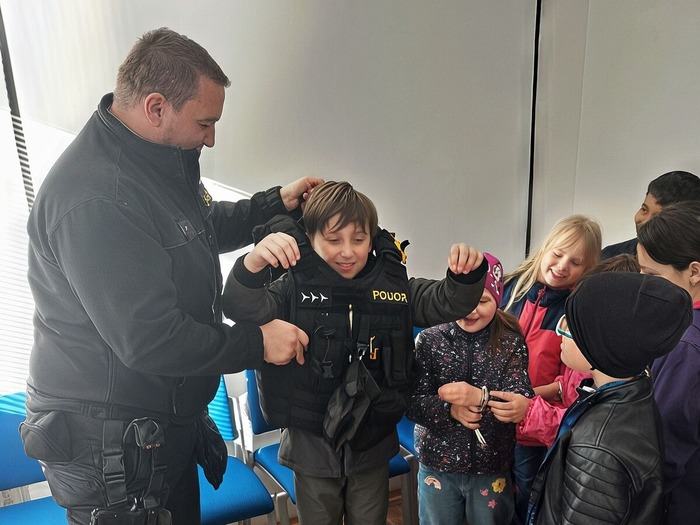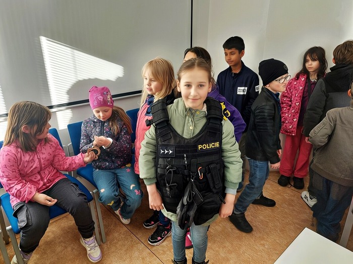 Dne 3. dubna 2025 jsme navštívili policejní služebnu v Hanušovicích. Na tento den jsme se moc těšili, protože nás tato práce velmi zajímá a někteří žáci by byli rádi policisty. Nejdříve jsme si prohlédli policejní auto. V policejní služebně jsme si vyzkoušeli neprůstřelnou vestu, obušek a pouta. Mohli jsme se na všechno, co nás zajímá zeptat. Také jsme si zopakovali, jak se máme chovat bezpečně na silnici a při hrách venku. Chtěli jsme vidět i výslechovou místnost a celu předběžného zadržení. Ve výtvarné výchově jsme jim namalovali obrázky, které jsme jim předali. Děkujeme Policii ČR a panu Hanákovi za prohlídku policejní stanice.
