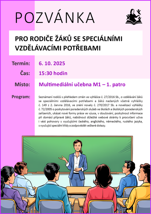 zveme Vás na informativní schůzku, která se uskuteční v pondělí 6. října 2025 v 15:30 hod. v budově ZŠ a MŠ v Hanušovicích v multimediální učebně v 1. patře. Náplní tohoto setkání je vás seznámit s přehledem změn ve vyhlášce č. 27/2016 Sb., o vzdělávání žáků se speciálními vzdělávacími potřebami a žáků nadaných včetně vyhlášky č. 149 z 2. června 2016, ve znění novely č. 270/2017 Sb. a novelizací vyhlášky č. 72/2005 o poskytování poradenských služeb ve školách a školských poradenských zařízeních, ukázat vám nové formy práce ve výuce, v doučování, poskytnout informace při domácí přípravě žáků, nabídnout důležité webové stránky k procvičení učiva i vést pohovory s vyučujícími českého, anglického, německého, ruského jazyka, s vyučující speciální třídy, zodpovědět veškeré dotazy.