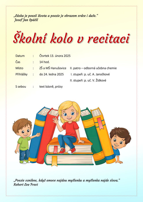 Ve čtvrtek 13. února 2025 ve 14 hod. se v ZŠ a MŠ Hanušovice ve druhém patře v odborné učebně chemie uskuteční Školní kolo v recitaci.